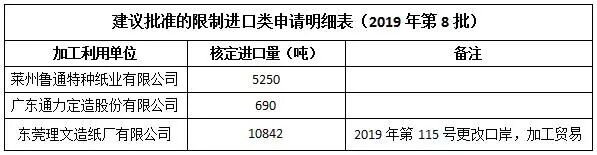 | 6月11日,生态环境部固废中心公布了2019年第8批废纸限制进口许可名单。仅2家纸厂获得废纸进口许可,总量为5940吨。