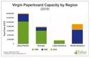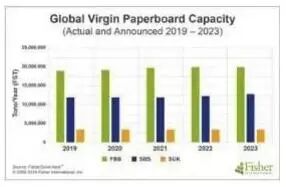 纵观塑料饮料杯,用纸张替代全球10%的塑料杯,估计需要588,000吨杯子,比2019年全球产能350万吨增加18%。目前,2019年之后没有新的杯子产能宣布。 如果我们计算在美国和欧洲可能的替换塑料包装,因为公众对塑料废物的关注仍在继续,Fisher估计,用纸替代5%的塑料将消耗150万吨纸。假设这一新产品是纸板(用于食品和饮料),下图显示这些品种在未来五年内实际和宣布的全球产能总量仅增加180万吨。如果更广泛地考虑纸板,包括回收品种,那么SmithersPira预计,到2022年,包装纸板的需求将每年增长4%。